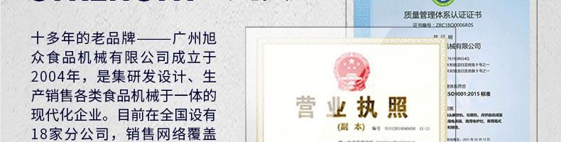 廣州旭眾食品機(jī)械有限公司是一家集科研開發(fā),生產(chǎn)設(shè)計,營銷服務(wù)為一體的現(xiàn)代化生產(chǎn)企業(yè)。現(xiàn)代化生產(chǎn)車間,精湛制造技術(shù),所產(chǎn)機(jī)械歷經(jīng)市場重重考驗(yàn),不斷贏得海內(nèi)外客戶的贊譽(yù)。