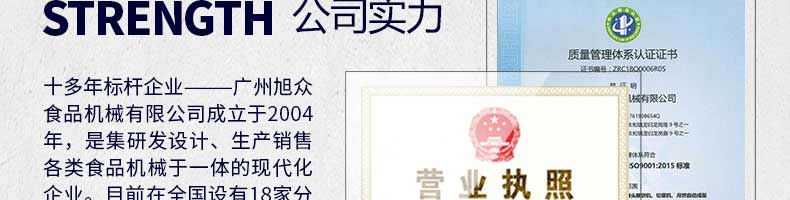 廣州旭眾食品機(jī)械有限公司是一家集科研開(kāi)發(fā),生產(chǎn)設(shè)計(jì),營(yíng)銷服務(wù)為一體的現(xiàn)代化生產(chǎn)企業(yè)?,F(xiàn)代化生產(chǎn)車間,精湛制造技術(shù),所產(chǎn)機(jī)械歷經(jīng)市場(chǎng)重重考驗(yàn),不斷贏得海內(nèi)外客戶的贊譽(yù)。