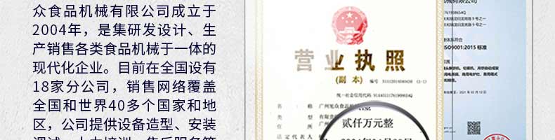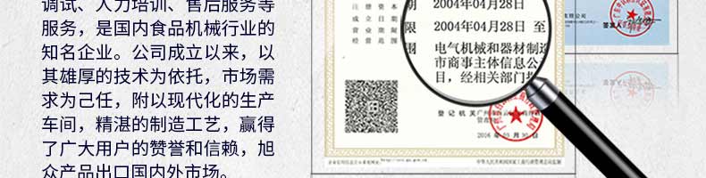 廣州旭眾食品機(jī)械有限公司是一家集科研開(kāi)發(fā),生產(chǎn)設(shè)計(jì),營(yíng)銷(xiāo)服務(wù)為一體的現(xiàn)代化生產(chǎn)企業(yè)?,F(xiàn)代化生產(chǎn)車(chē)間,精湛制造技術(shù),所產(chǎn)機(jī)械歷經(jīng)市場(chǎng)重重考驗(yàn),不斷贏得海內(nèi)外客戶(hù)的贊譽(yù)。
