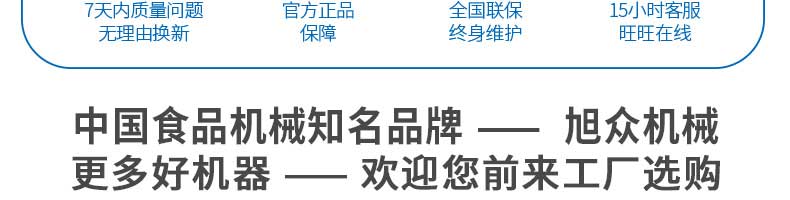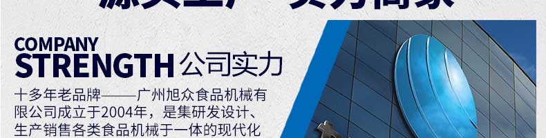 廣州旭眾食品機(jī)械有限公司是一家集科研開發(fā),生產(chǎn)設(shè)計,營銷服務(wù)為一體的現(xiàn)代化生產(chǎn)企業(yè)?,F(xiàn)代化生產(chǎn)車間,精湛制造技術(shù),所產(chǎn)機(jī)械歷經(jīng)市場重重考驗,不斷贏得海內(nèi)外客戶的贊譽。
