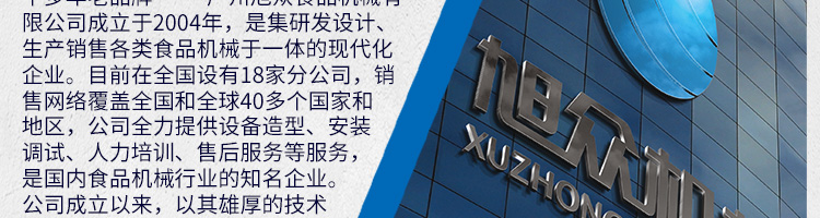 廣州旭眾食品機(jī)械有限公司是一家集科研開(kāi)發(fā),生產(chǎn)設(shè)計(jì),營(yíng)銷(xiāo)服務(wù)為一體的現(xiàn)代化生產(chǎn)企業(yè)?,F(xiàn)代化生產(chǎn)車(chē)間,精湛制造技術(shù),所產(chǎn)機(jī)械歷經(jīng)市場(chǎng)重重考驗(yàn),不斷贏得海內(nèi)外客戶的贊譽(yù)。