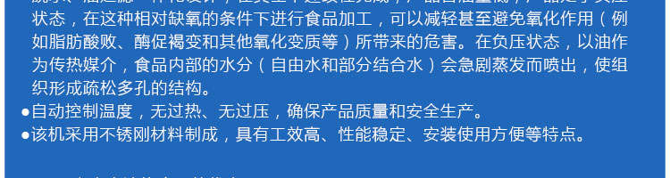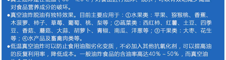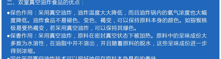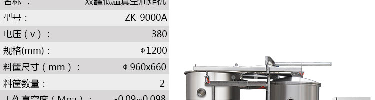 zk-1200雙罐低溫真空油炸機,適用于水果類、蔬菜類、干果類、水產(chǎn)品機畜禽肉類等。油炸食品不易褪色、褐色,可以保持原料本身的顏色
